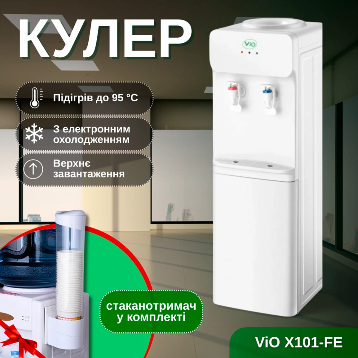 Кулер ViO X101-FE — це компактний і функціональний пристрій, який забезпечує зручний доступ до гарячої та холодної питної води. Модель відзначається сучасним дизайном, простим керуванням та високою надійністю, що робить її чудовим рішенням для дому, офісу чи невеликих комерційних приміщень.