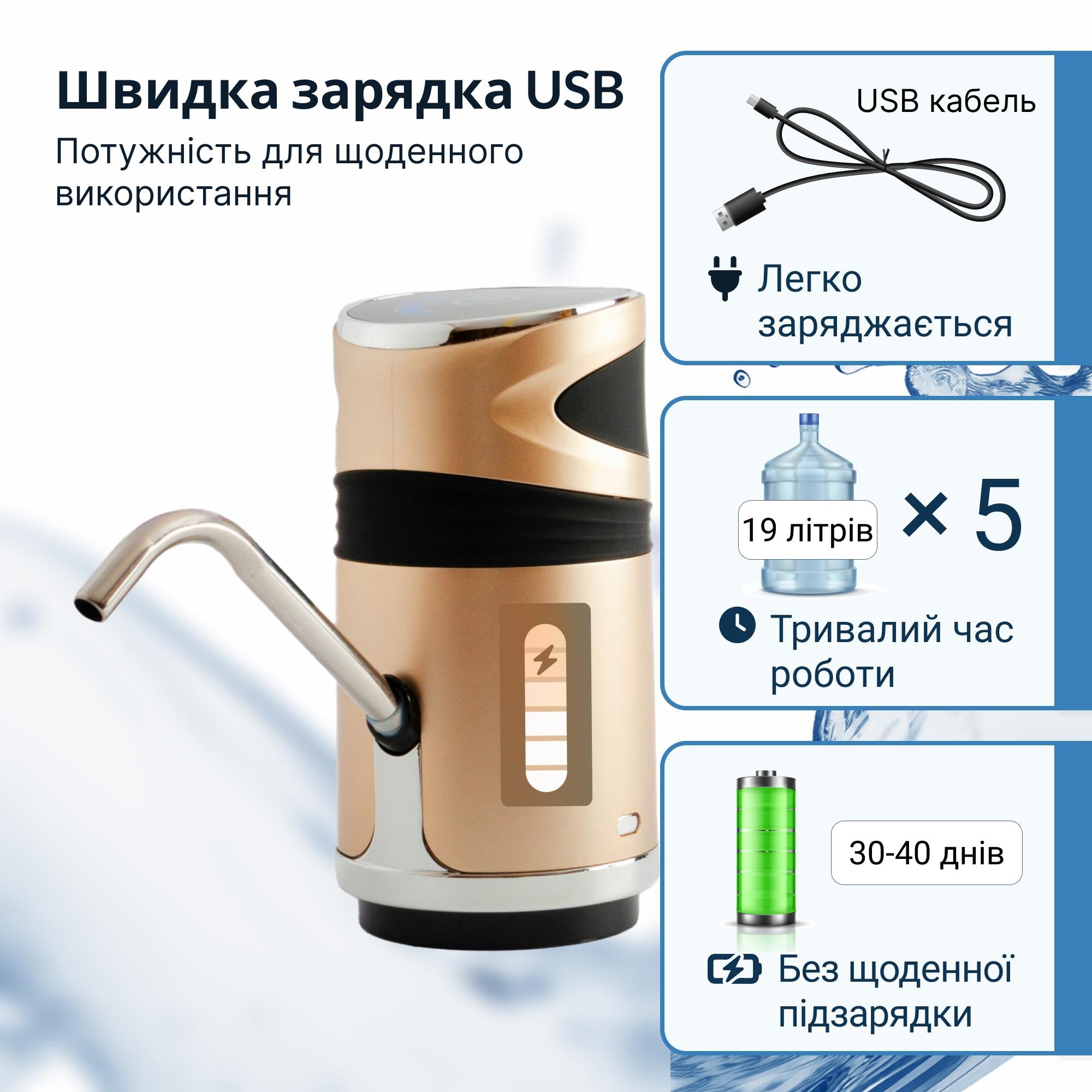 Помпа обладнана вбудованим акумулятором великої ємності, який заряджається через USB та забезпечує тривалу роботу без підключення до електромережі. Це робить ViO E12-DS зручною для використання вдома, на дачі, у подорожах або офісі.