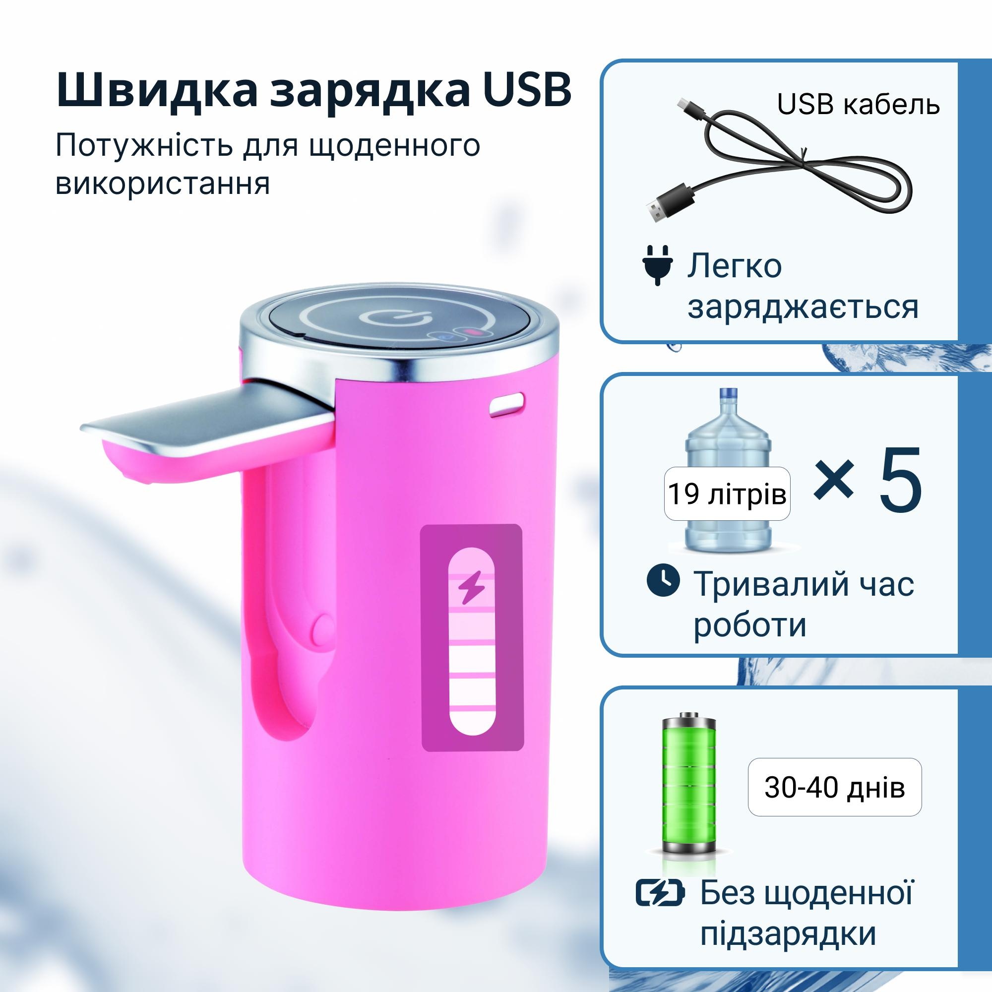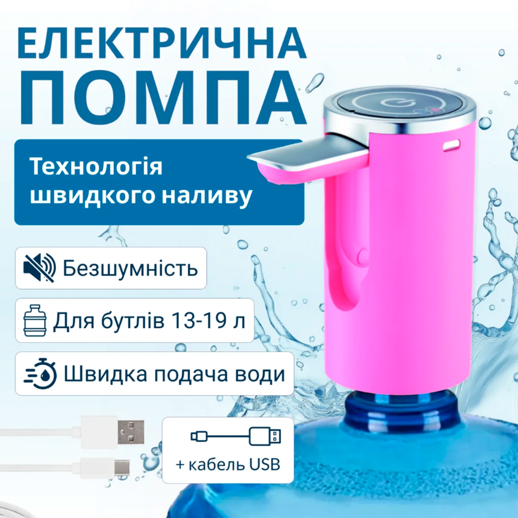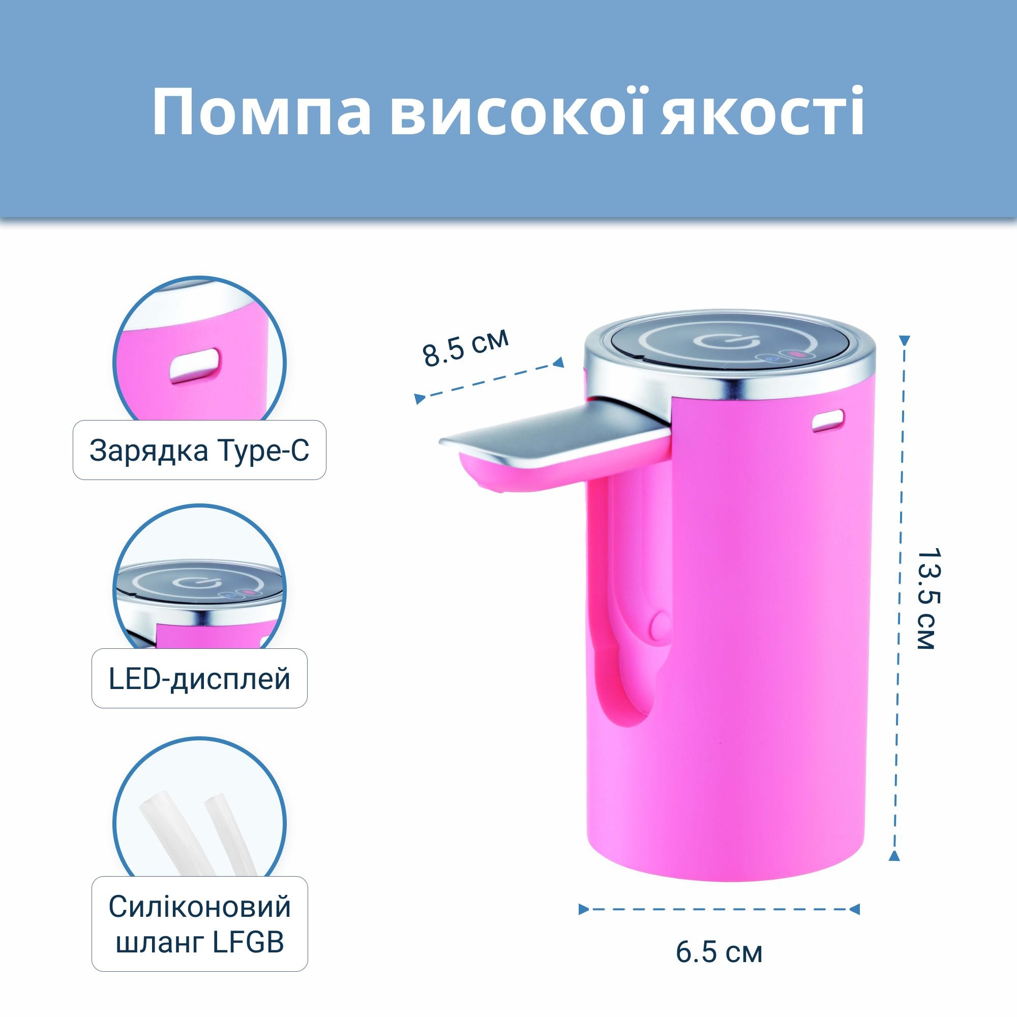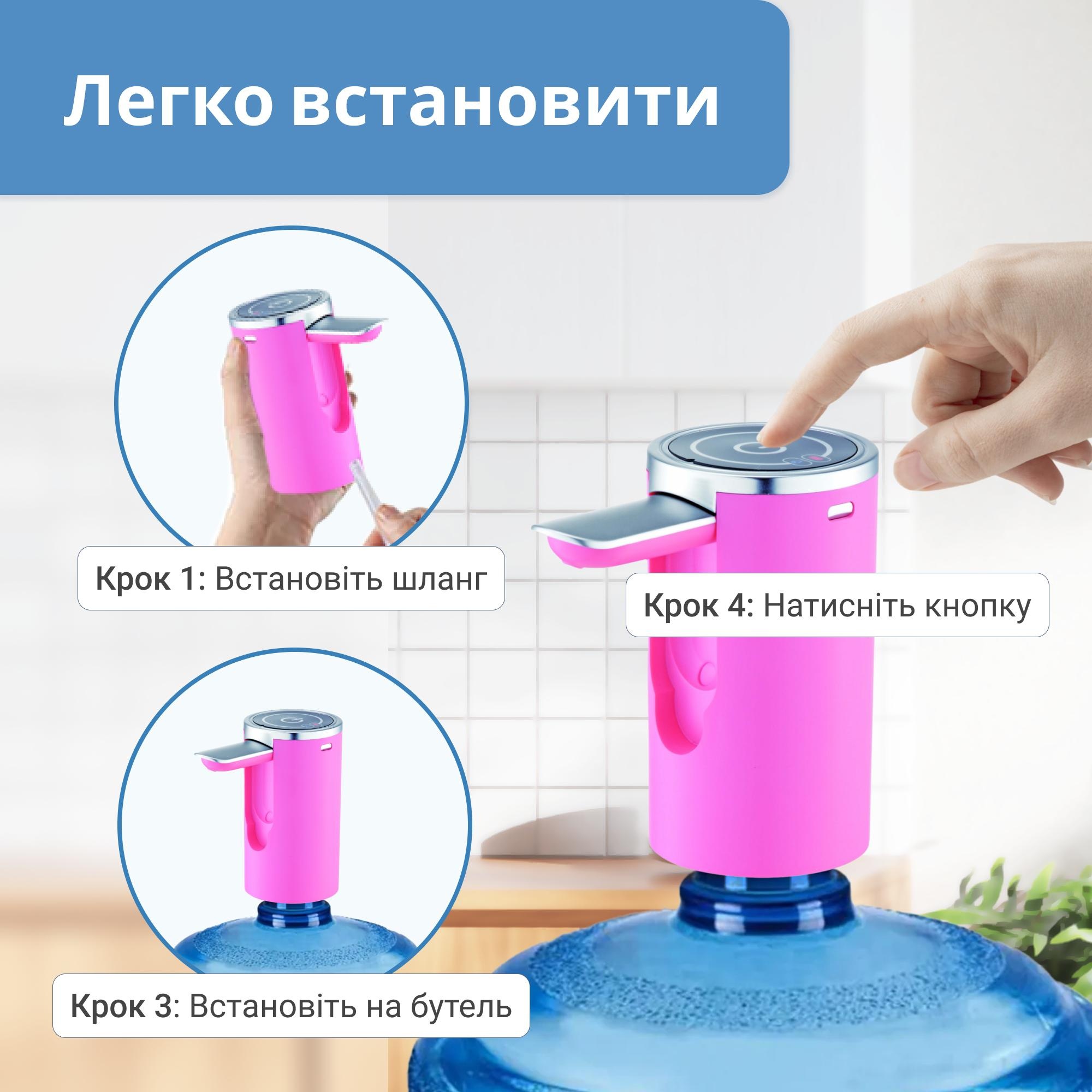 Помпа сумісна зі стандартними бутлями 13 і 19 літрів, завдяки чому легко інтегрується у будь-який побутовий чи робочий простір. Просте керування однією кнопкою дозволяє швидко вмикати та вимикати подачу води.